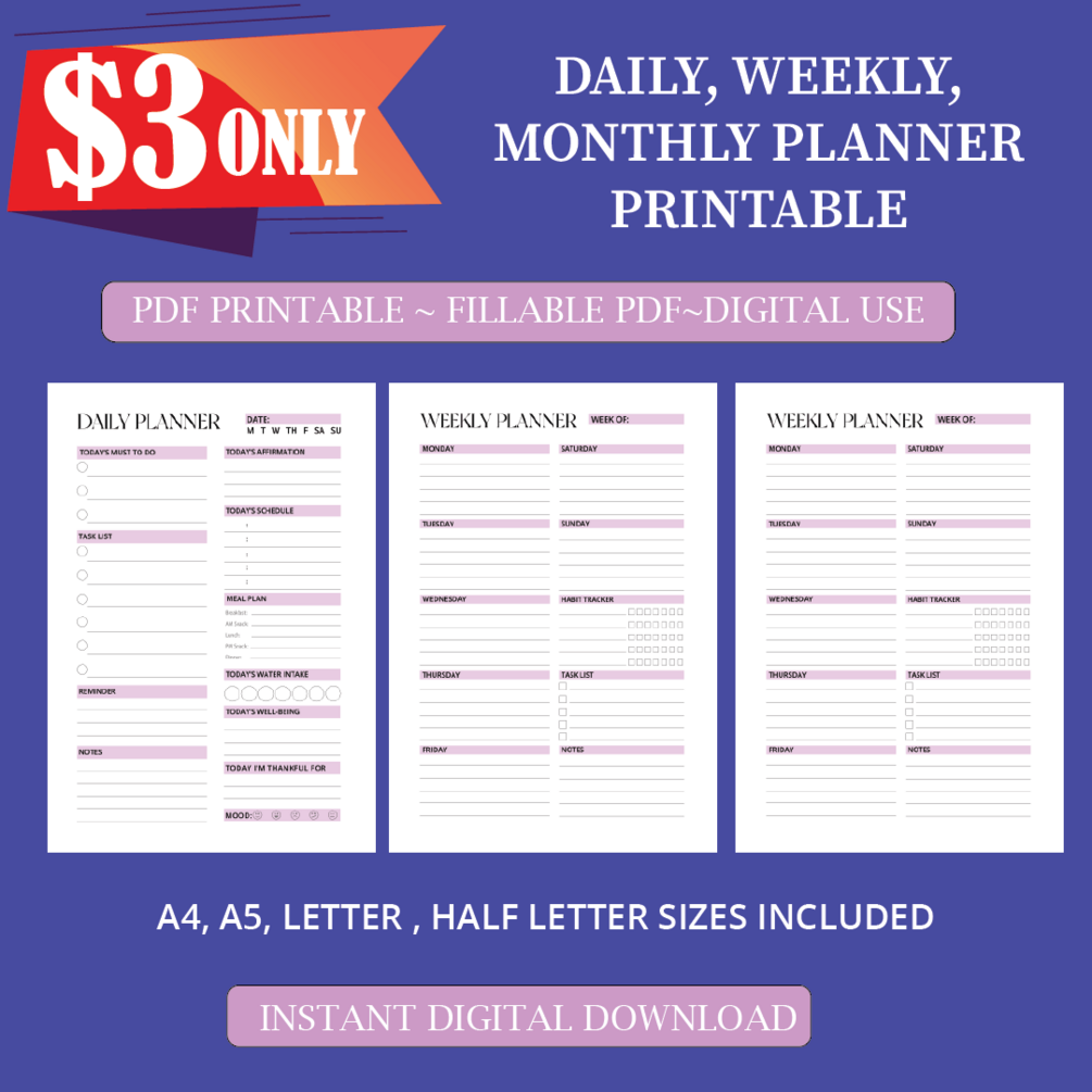 Daily planner, Weekly planner, Monthly planner, Digital planner, Fillable planner, Printable planner, instant download, A4, A5, Letter and Half letter size